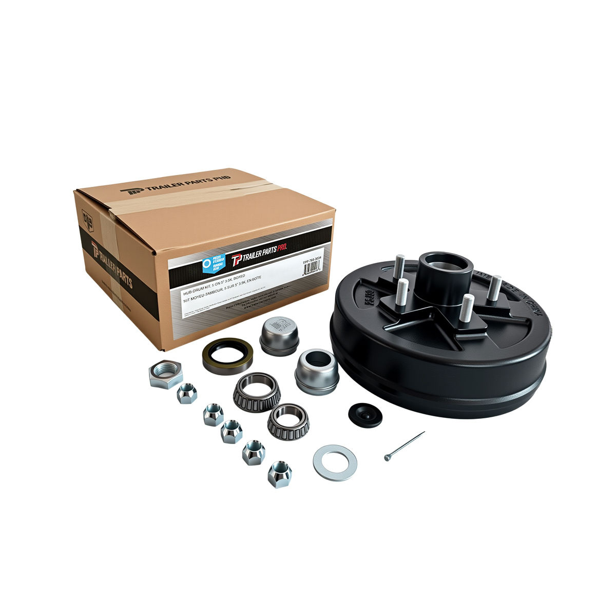 Trailer Parts Pro Hub-Drum Kit, 3,500 Lbs Capacity (1,750 Lbs Each), 5 on 5.0" Bolt Pattern, 1/2" Studs. Comes with Bearings, Grease Seal, Grease Caps and Plug, Wheel Nuts, Spindle Washer and Cotter Pin. Retail Boxed