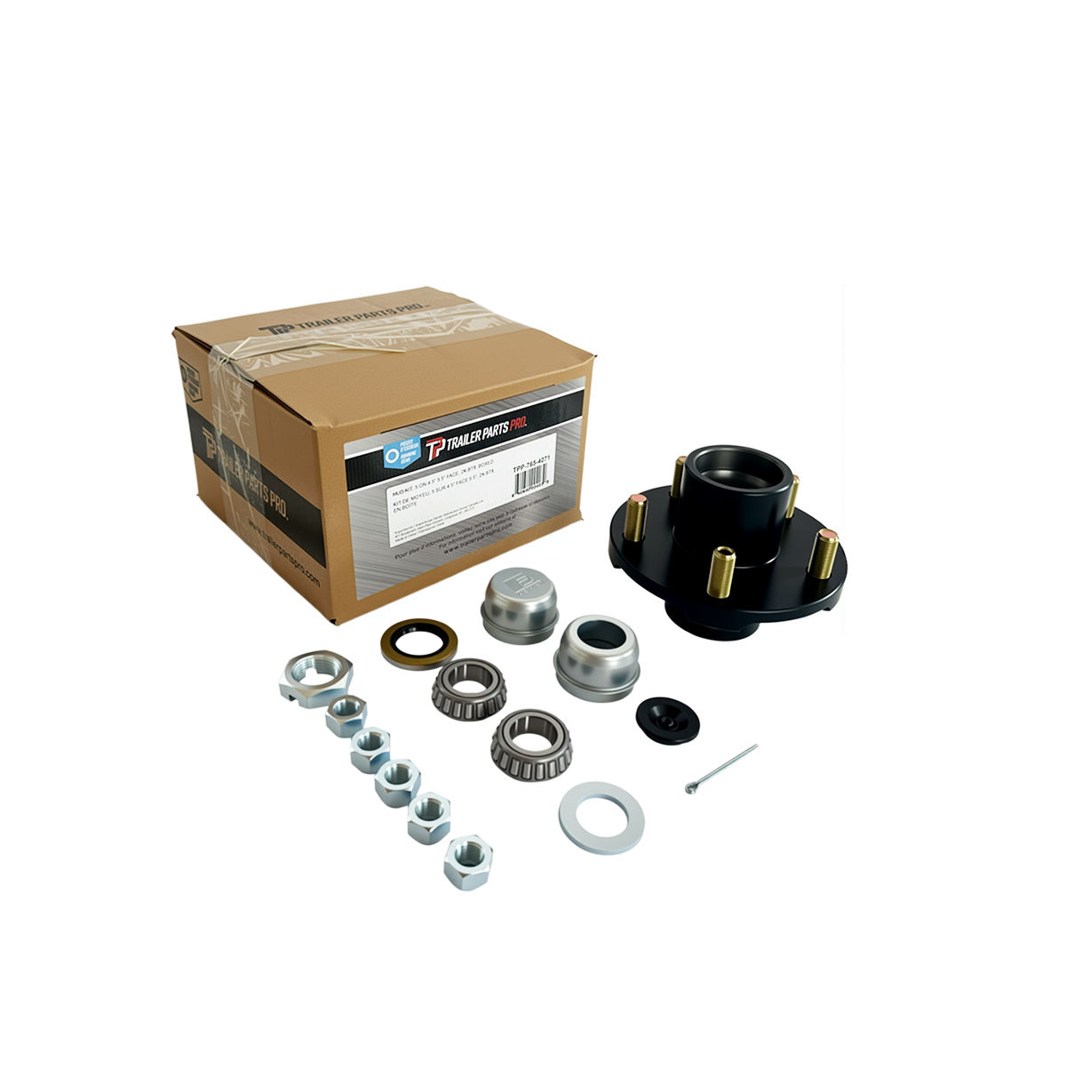 Trailer Parts Pro™ Idler Hub Kit, 2,200 Lbs, Compatable with BT8 (1") Spindles, 5.50" Diameter Hub Face (Small Wheel), 5 on 4.5" Bolt Pattern, Comes with Bearings, Races, Grease Seal, Grease Cap, EZ-Lube Grease Cap and Plug, Wheel Nuts, Spindle Nut, Spindle Washer