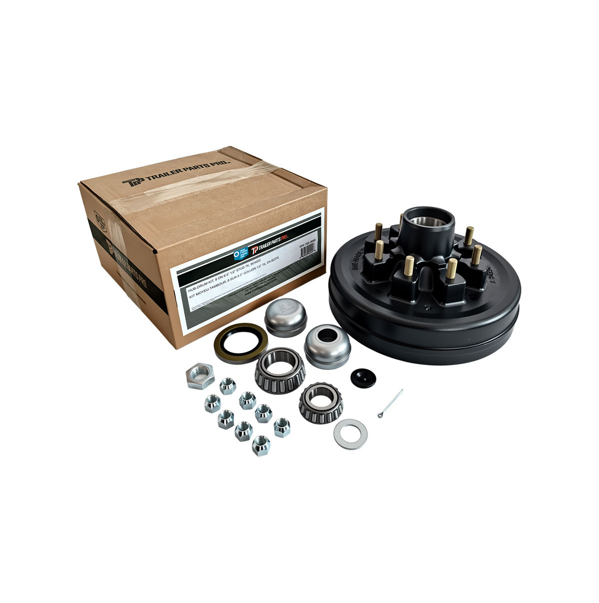 Trailer Parts Pro Hub-Drum Kit, 7,000 Lbs Capacity (3,500 Lbs Each), 8 on 6.5"" Bolt Pattern, 1/2" Studs. Comes with Bearings, Grease Seal, Grease Caps and Plug, Wheel Nuts, Spindle Washer and Cotter Pin. Retail Boxed