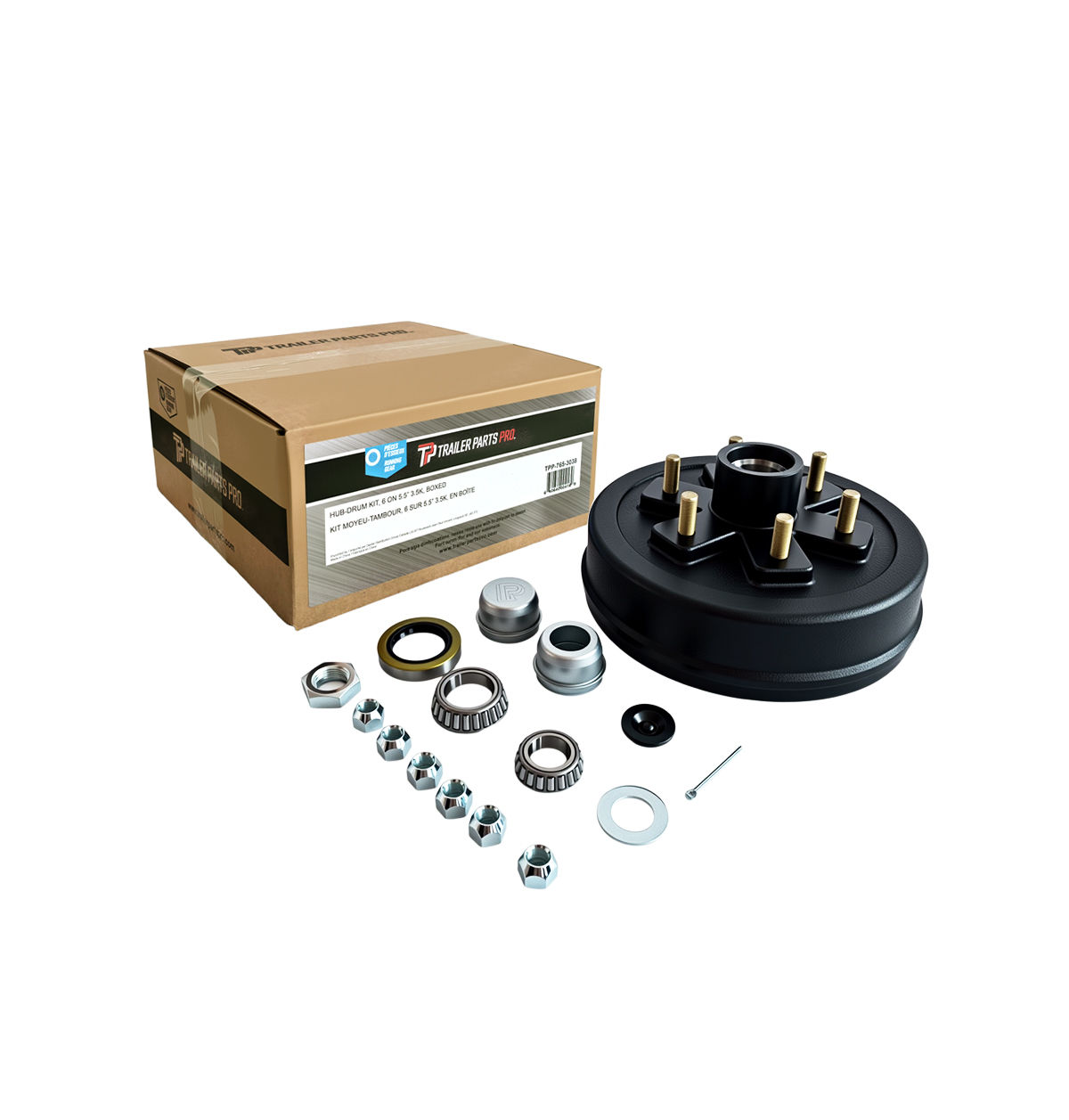 Trailer Parts Pro Hub-Drum Kit, 3,500 Lbs Capacity (1,750 Lbs Each), 6 on 5.5"" Bolt Pattern, 1/2" Studs. Comes with Bearings, Grease Seal, Grease Caps and Plug, Wheel Nuts, Spindle Washer and Cotter Pin. Retail Boxed