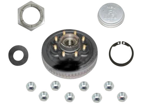 Dexter One Piece Hub-Drum Kit. 7,000 Lbs Capacity per Pair (3,500 Lbs Each), 50mm Nev-R-Lube® Bearing Cartridge, 8 on 6.5" Bolt Pattern, 5/8" Studs, Comes With Bearing, Retainer, Snap Ring, Nev-R-Lube® Cap