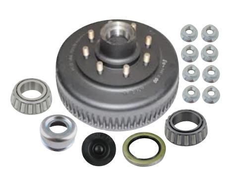 Dexter Hub-Drum Kit. Compatible with 7,200 Lbs Axles with E-Z-Lube Spindles, 7,200 Lbs Capacity per Pair (3,600 Lbs Each), 8 on 6.5" Bolt Pattern, 5/8" Studs, 4.75 Pilot, Grease Lubrication. Comes with Bearings, Grease Seal, E-Z Lube Grease Cap, Flange Wheel Nuts