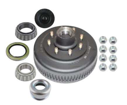 Dexter Hub-Drum Kit. Compatible with 7,200 Lbs Axles with E-Z-Lube Spindles, 7,200 Lbs Capacity per Pair (3,600 Lbs Each), 8 on 6.5" Bolt Pattern, 5/8" Studs, 4.75 Pilot, Grease Lubrication. Comes with Bearings, Grease Seal, E-Z Lube Grease Cap, Cone Wheel Nuts