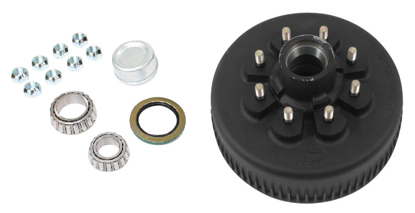 Dexter One Piece Hub-Drum Kit. Compatable With 8,000 Lbs Axles, 8 on 6.5" Bolt Pattern, 9/16" Studs, 8,000 lbs Capacity Per Pair (4,000 Lbs Each), Grease Lubrication, Comes With Bearings, Grease Seal, Grease Cap, Coned Wheel Nuts , 4.75" Pilot