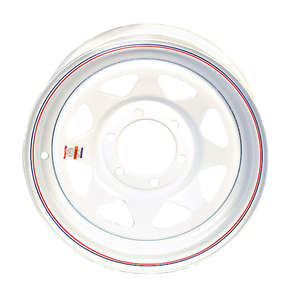 Steel Trailer Wheel, 15 x 6", 6 on 5.5" Bolt Pattern, 4.27" Pilot, Spoke Style, White with Pinstripes